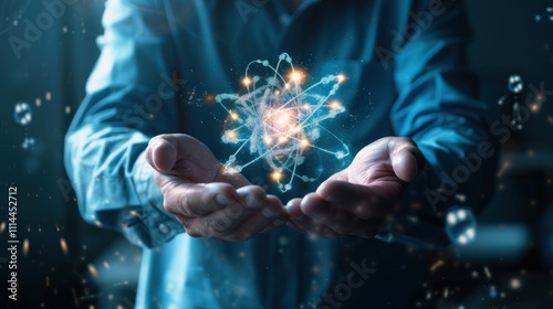 Hands Holding an Atomic Structure in a Blue and Orange Glow