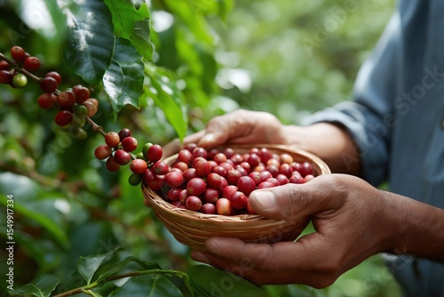 Hands holding basket of fresh coffee cherries in lush green garden