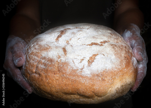 Hands holding fresh round bread.