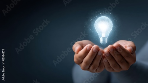 Hands holding glowing light bulb representing creativity, innovation, ideas, inspiration, and new beginnings in a dark setting with sparkling elements