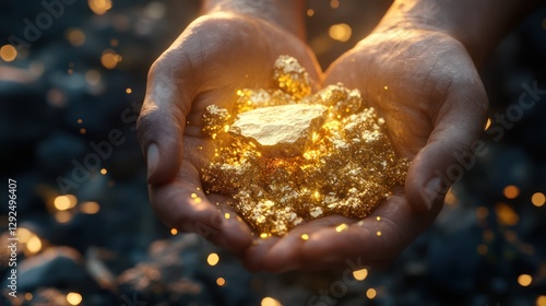 Hands holding gold nuggets, glowing, dark background, wealth concept