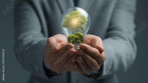 Hands Holding Light Bulb with Tree Inside, Eco - Friendly Concept