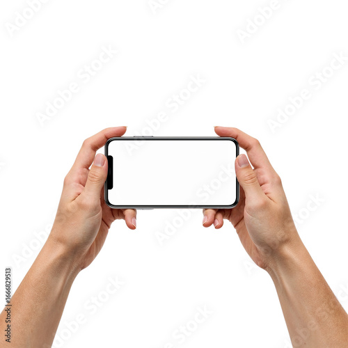 Hands holding modern smartphone with blank screen against seamless transparent display view