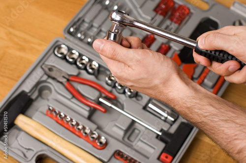 Hands holding ratchet and head over toolbox