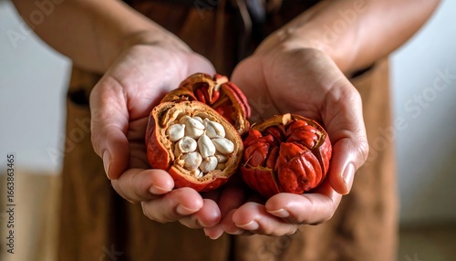 Hands holding ripe cacao pods with visible beans, showcasing natural cocoa fruit.