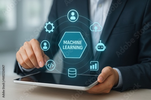 Hands interacting with a digital tablet display showcasing a machine learning concept, with various related technology icons arranged around a central hexagon.