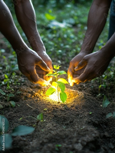 Hands Nurturing Glowing Seedling in Forest—Environmental Conservation Concept