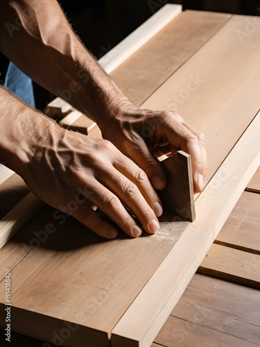 Hands of a Carpenter Working on Wooden Surface