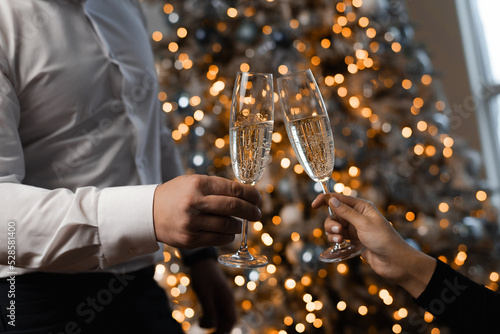 hands of a man and a woman with glasses of champagne against the background of the lights of garlands