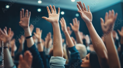Hands of crowd in air in a vote event in a office room during an executive board meeting.