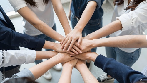 Hands of diverse people are stacked together symbolizing teamwork and unity on bright background