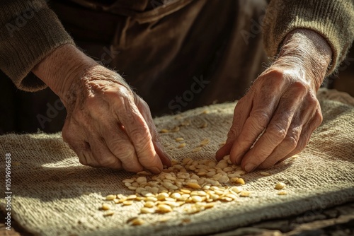 Hands of elderly person sorting pumpkin seeds on burlap in warm sunlight, traditional agriculture, rustic simplicity concept