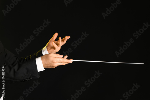 Hands of male conductor with baton on black background