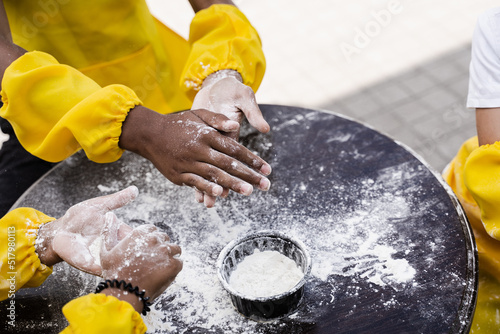 Hands of multinational children cooks play with flour for dough and having fun close-up. Young cooks children cooking khachapuri