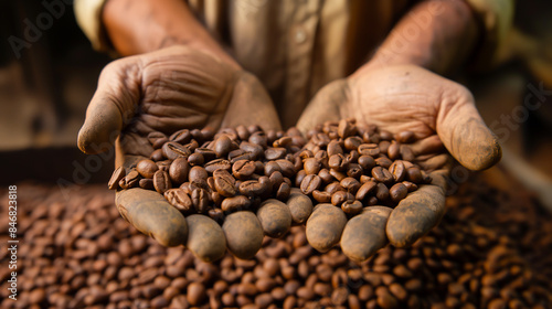 Hands of people holding roasted coffee beans, A worker inspects fragrant roasted coffee beans taking them in his hands at production plant