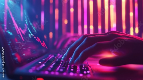Hands on Laptop Analyzing Data with Colorful Neon Lights Background