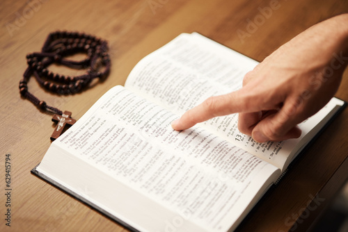 Hands, person and reading bible with rosary cross for praying, spiritual faith and holy worship of God. Closeup of christian studying religion, gospel prayer books and learning praise to Jesus Christ