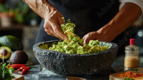 Hands Preparing Homemade Guacamole in a Stone Bowl