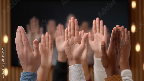 Hands raised against a blurred background, symbolizing participation and engagement in a group setting.