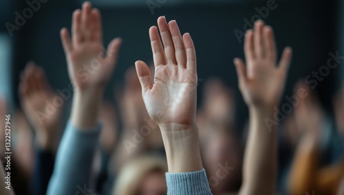 Hands raised in the air during a group meeting symbolizing voting participation teamwork unity collaboration and active engagement