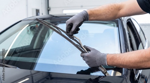 Hands replacing windshield wiper blades on a car in auto service