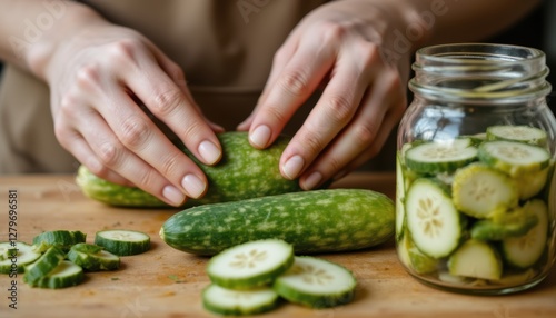 Hands Slicing Cucumbers on Wooden Cutting Board with Jar of Pickled Cucumbers in Background