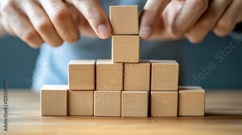 Hands Stacking Wooden Blocks in Close-Up Focus on Details