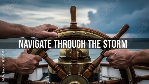 Hands Steering Ship Wheel Through Stormy Seas