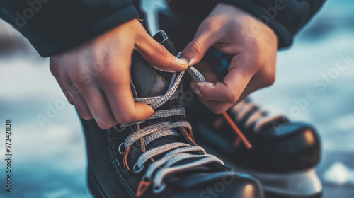 Hands tying laces on ice skates in preparation for winter activity on frozen surface. The focus highlights precision and readiness for outdoor sports