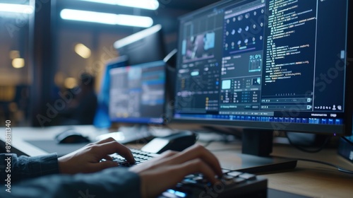 Hands typing, computer screen, work interface, focused, organized workspace
