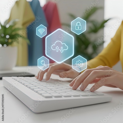 Hands Typing on a Keyboard, Engaging with an Advanced Digital Interface, Cloud Computing, Data Security, Internet Connectivity, and System Management Icons