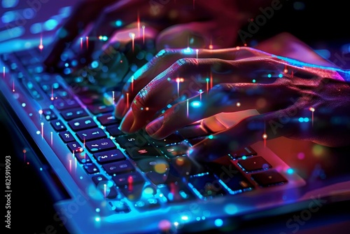 Hands typing on a laptop keyboard with colorful lights and digital effects, symbolizing technology, innovation, and coding.