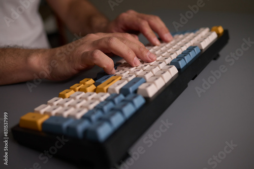 Hands typing on a mechanical keyboard in a workspace, enhancing productivity and focus