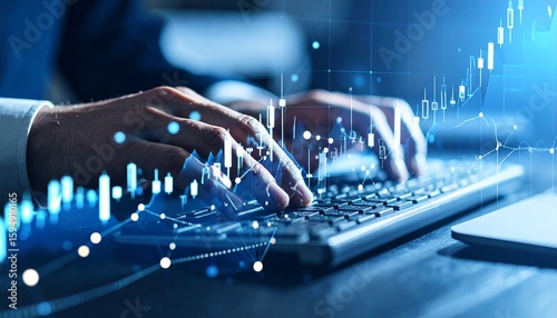 Hands typing on keyboard with digital data and analysis graphics overl