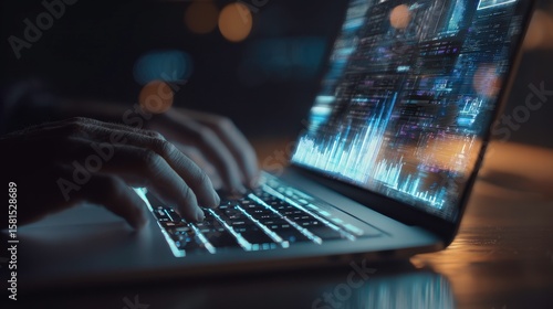 Hands Typing on Laptop with Data Visualization in Dark Environment