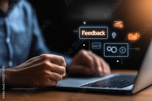 Hands Typing on Laptop with Feedback Icons Floating Above in Dark Environment for Business and Technology Use