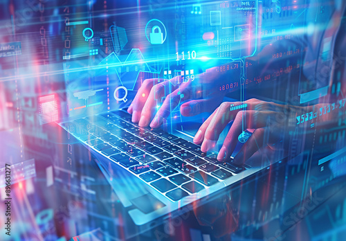 Hands Typing on Laptop with Futuristic Digital Interface and Cybersecurity Icons