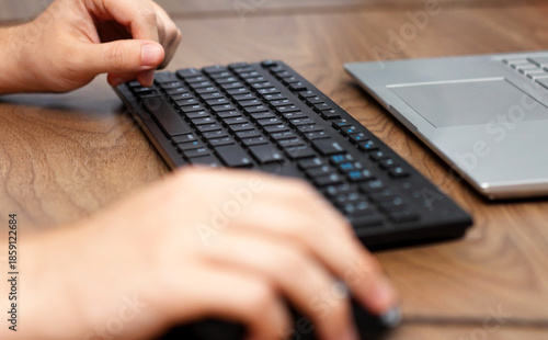Hands Using External Keyboard and Mouse with Laptop, Close-up