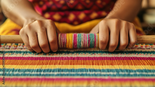 Hands weaving colorful threads on a loom.
