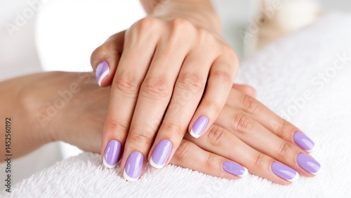Hands with a lavender manicure featuring classic white French tips are gently resting on a soft towel in a calm spa environment. Natural light enhances the relaxing atmosphere.
