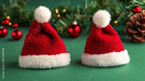 Hand-sewn mini Santa hats with pom-poms, isolated on a green background with holiday accents