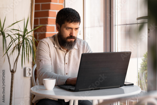 Handsome bearded man working on laptop at restaurant, guy working in online freelancing drinks coffee