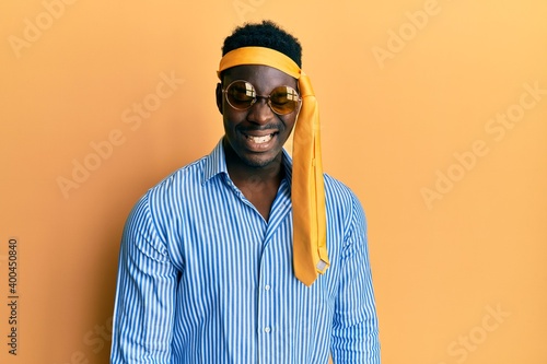 Handsome black man drunk wearing tie over head and sunglasses winking looking at the camera with sexy expression, cheerful and happy face.