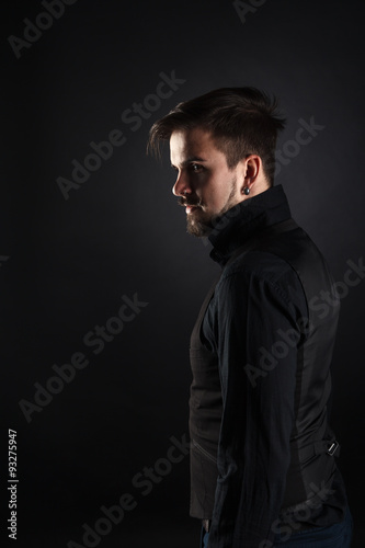 handsome brutal guy with beard on dark background