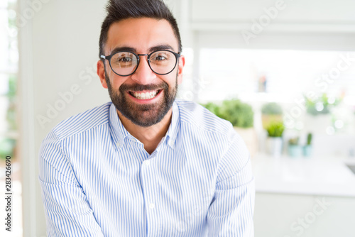 Handsome business man wearing glasses and smiling cheerful with confident smile on face