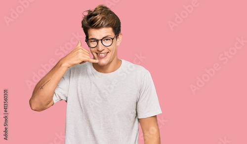 Handsome caucasian man wearing casual clothes and glasses smiling doing phone gesture with hand and fingers like talking on the telephone. communicating concepts.