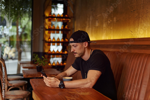 Handsome Caucasian student dressed in sporty clothes and hat using mobile phone, looking at screen with serious and concentrated expression while having coffee in cafe after classes at university.