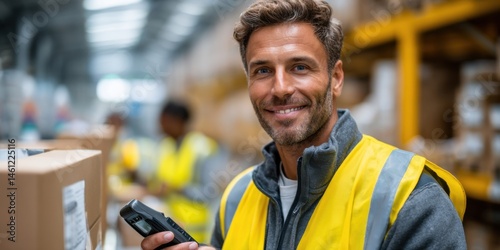 Handsome man, a worker wearing a yellow safety vest holding hold a scanner hin his hand and scan a box in a large warehouse with a team working behind him.