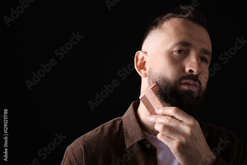 Handsome man combing beard on black background, space for text