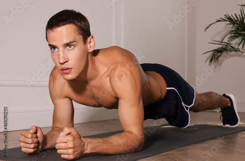 Handsome man doing plank exercise on floor indoors